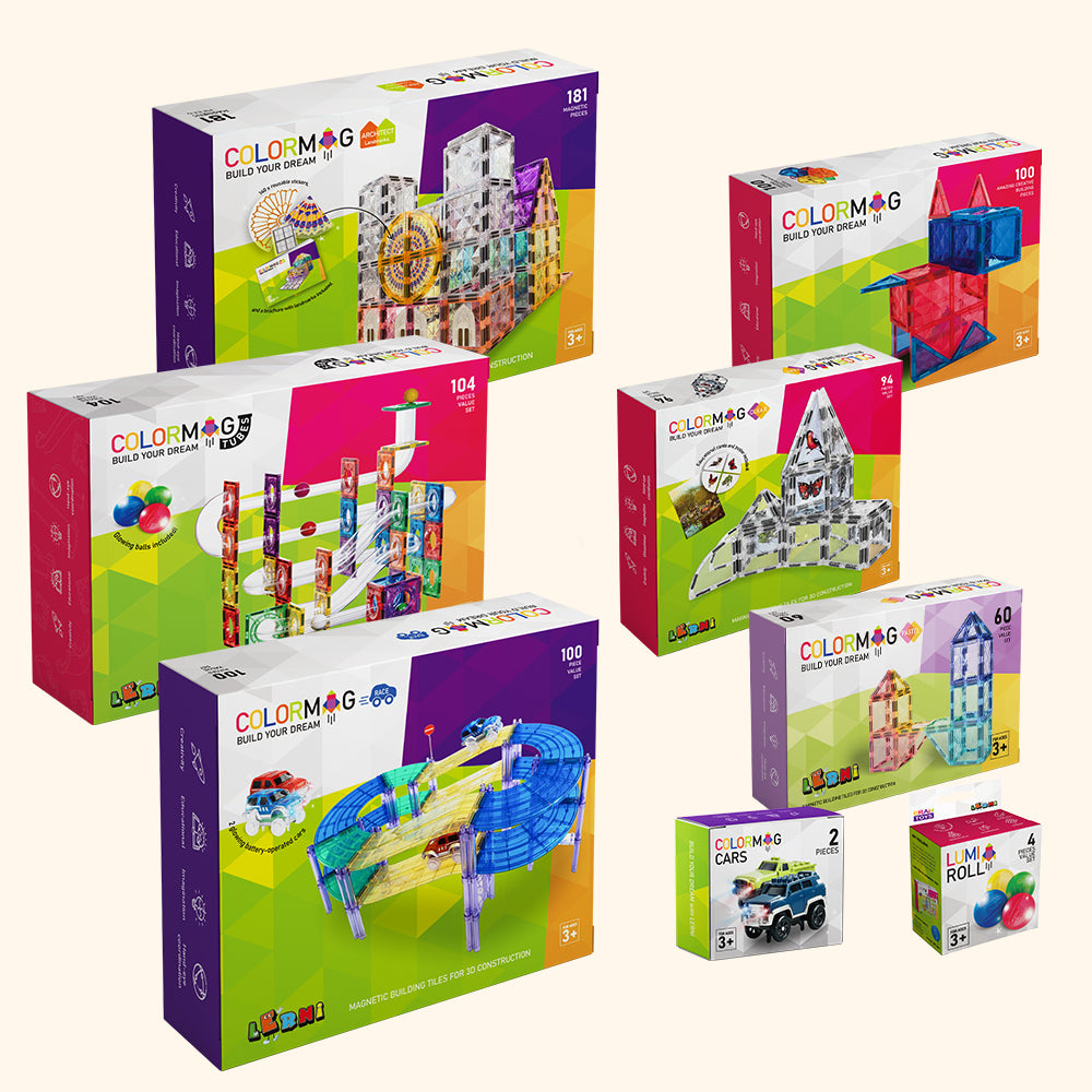 - Kompletný zážitok – Obsahuje všetky najlepšie stavebnice z rady Colormag (Race, Architect, Tubes, Clear, 60 a 100 ks), čo znamená nekonečné možnosti tvorby
