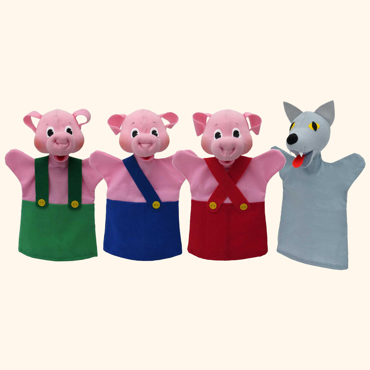 Komu sa nelení, tomu vlk domček len tak nevyfúkne, teda neodfúkne. Šikovné prasiatka to vedia a tie menej šikovné, majú šikovného brata. Vymyslite si so sadou maňušiek rôzne dobrodružstvá a príbehy a porozprávajte ich svojmu dieťatku. Hranie s bábkami výborne stimuluje ich fantáziu a kreativitu a tiež im pomáha začať osmeliť sa na verejnosti.