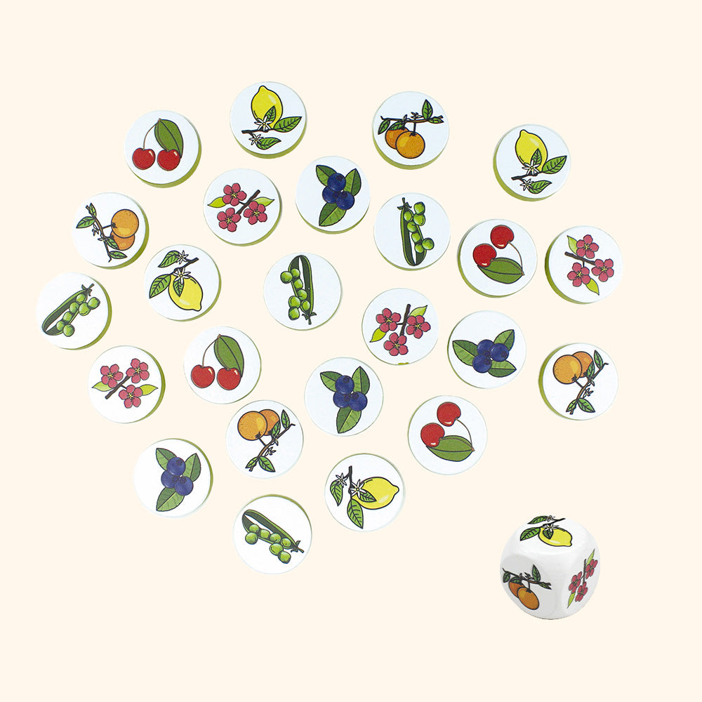 - 24 drevených žetónov s jedlom pre húsenice (Ø 30 mm)