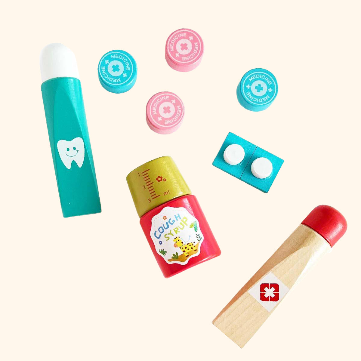 sada obsahuje kvalitné lekárske pomôcky na hru vyrobené z dreva,