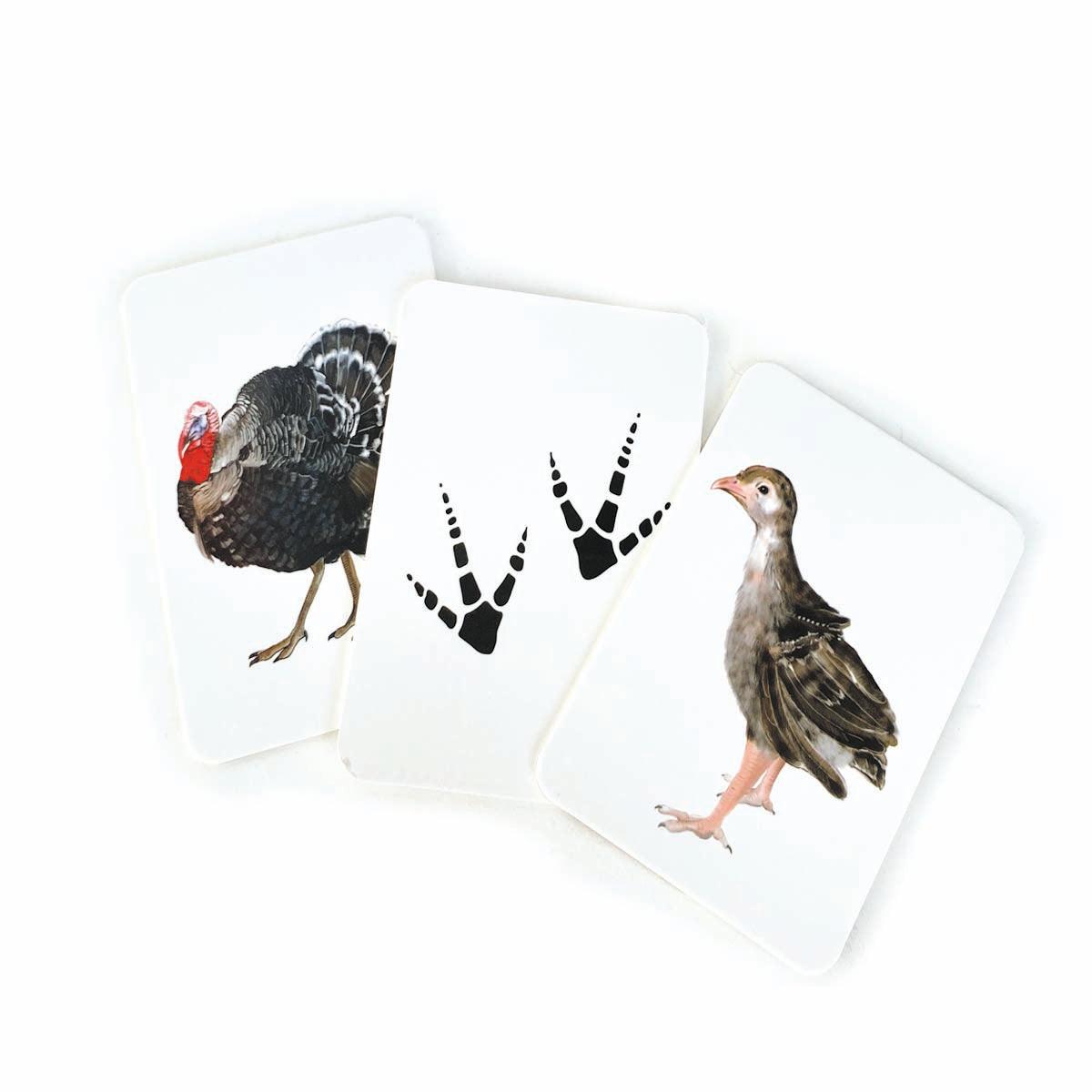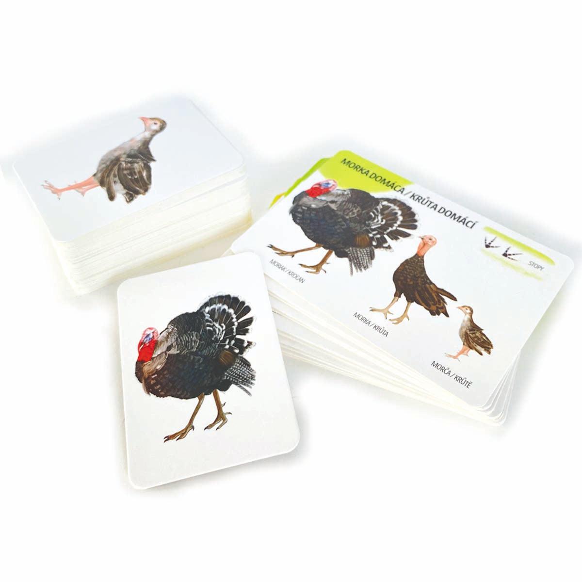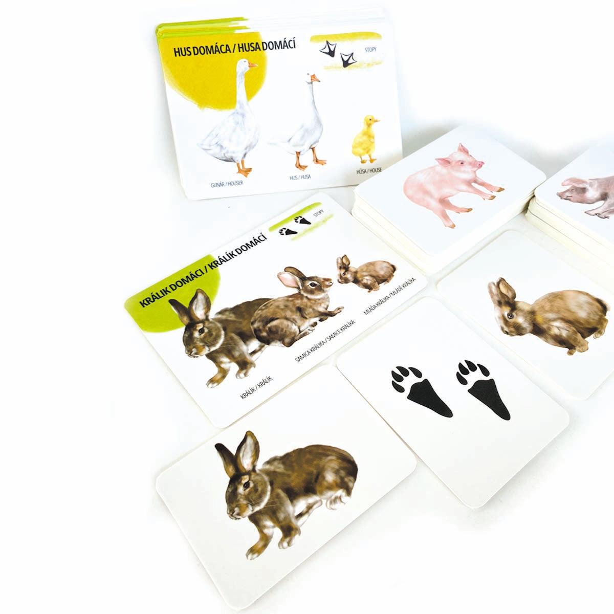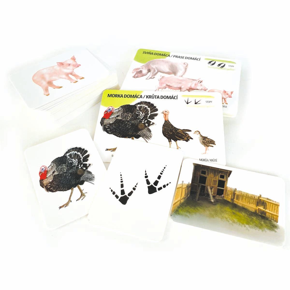 • 12 kariet  vo formáte A6 (na prednej strane sa nachádza názov zvieraťa, vyobrazenie samca, samice, mláďaťa a stopa, ktorú zanecháva; na zadnej strane je stručný text a vyobrazenie prirodzenej potravy, ktorou sa zvieratko živí) - karty obsahujú text v slovenskom a českom jazyku