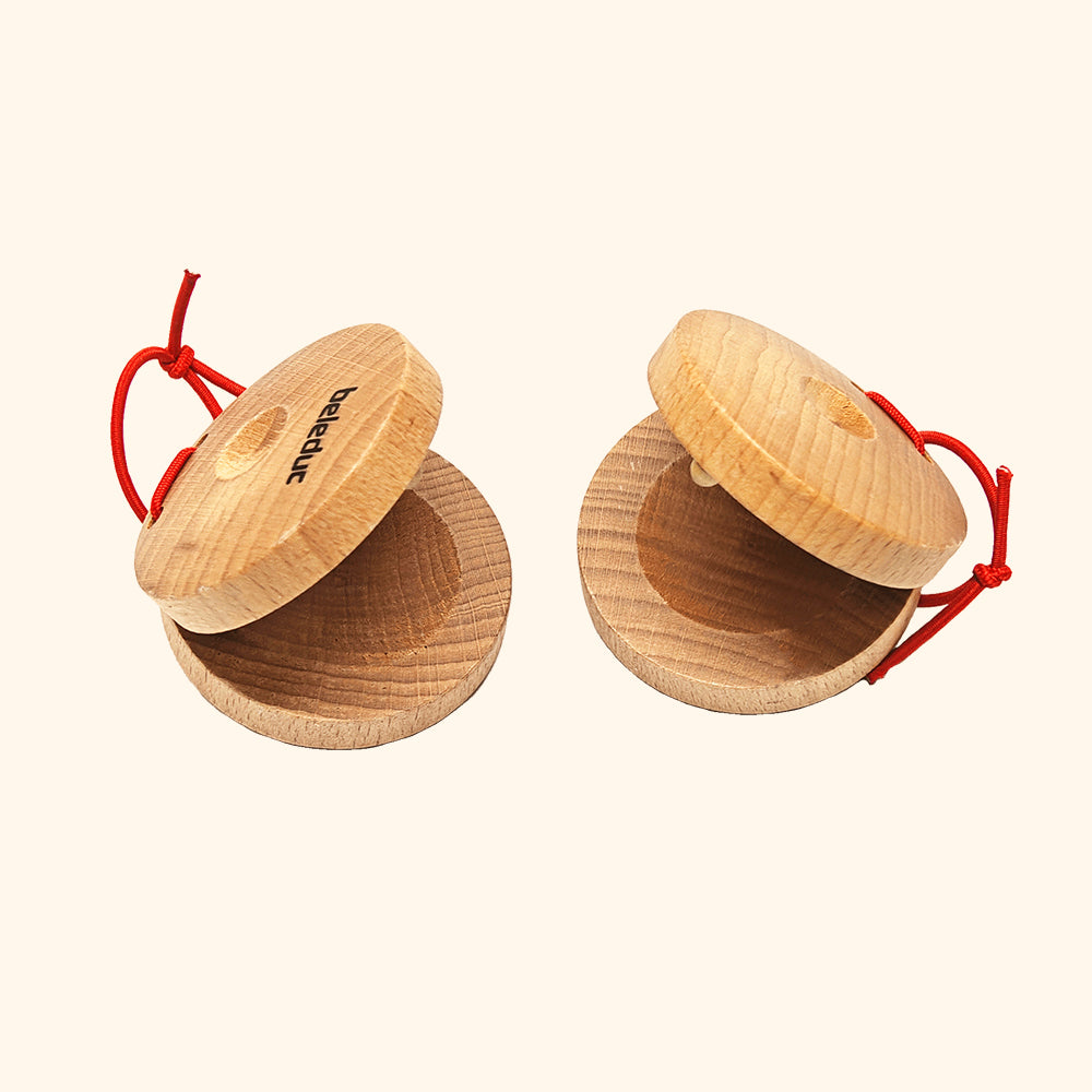 Malé drevené kastanety majú pružnú šnúrku, ktorá umožňuje automatické otvorenie pri stlačení — tak sú jednoduché na používanie aj pre mladšie deti.