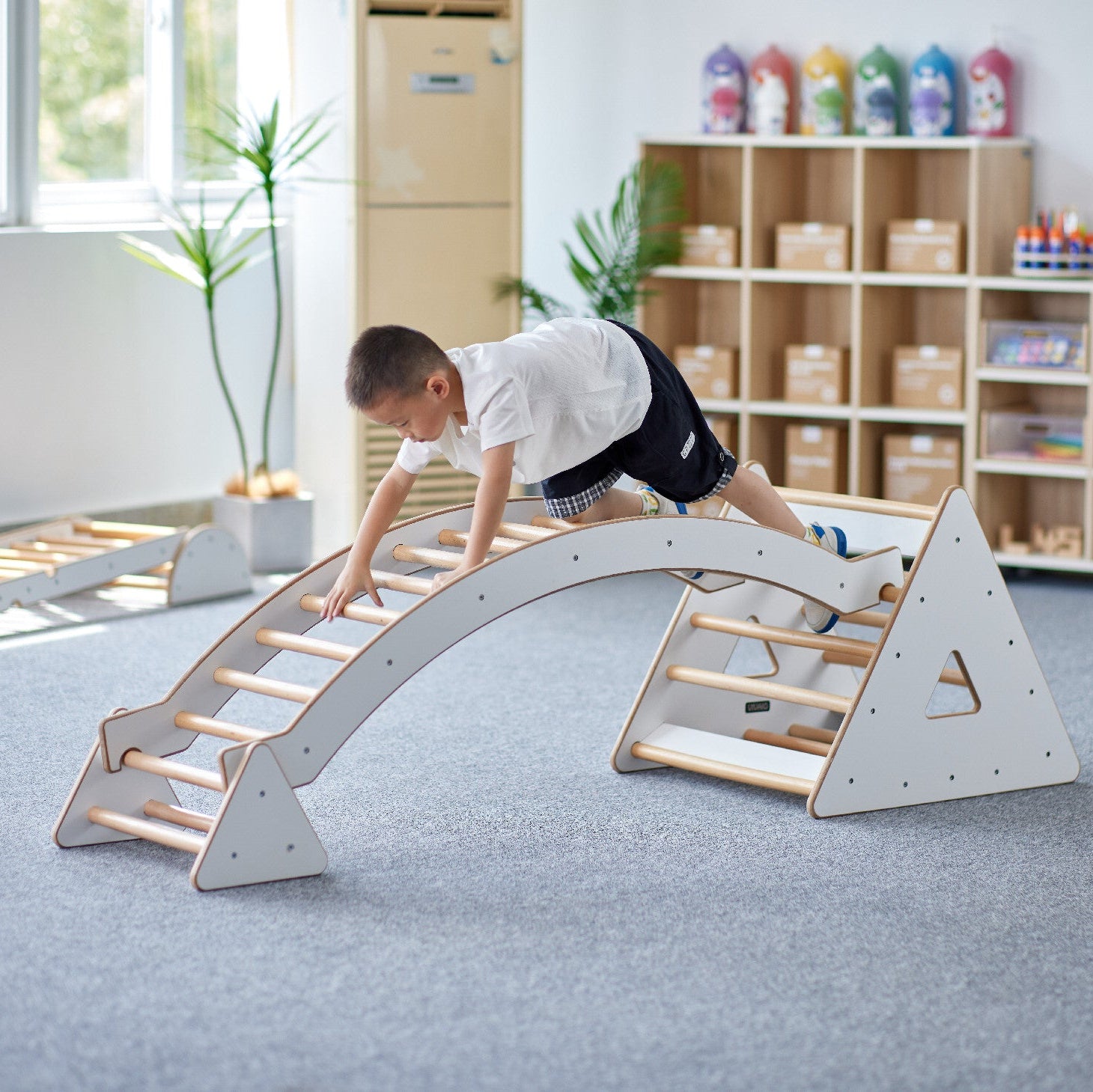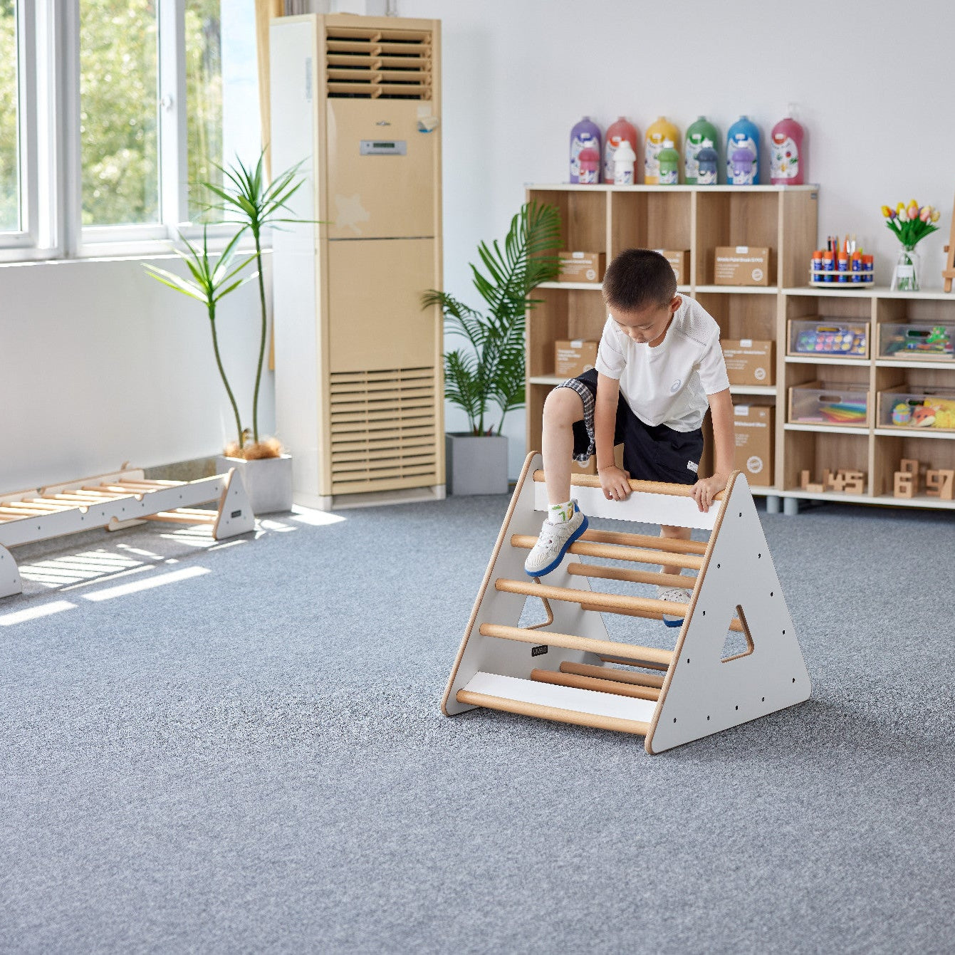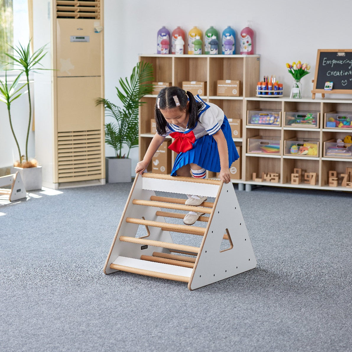 Trojuholníkový balančný prvok pozýva deti pohybovať sa prirodzene – liezť, balansovať a objavovať telom. Vďaka svojmu tvaru podporuje stabilitu a rozvíja zmysel pre rovnováhu pri hravých aktivitách.