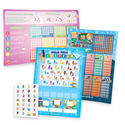 Prvé dôležité vedomosti na prvých vlastných edukačných tabuľkách! Tento unikátny set pomôže deťom zábavnou formou zvládnuť základné návyky, písmenká aj čísla.