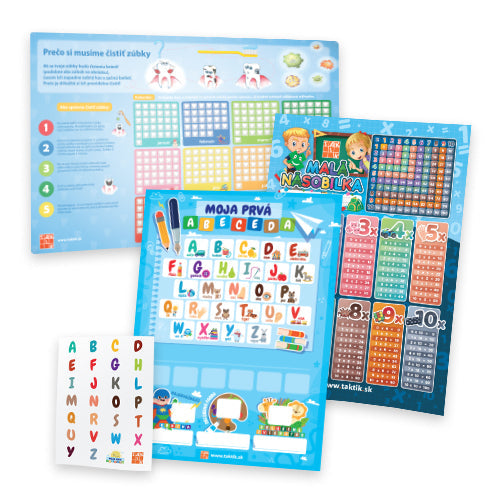 Prvé dôležité vedomosti na prvých vlastných edukačných tabuľkách! Tento unikátny set pomôže deťom zábavnou formou zvládnuť základné návyky, písmenká aj čísla.