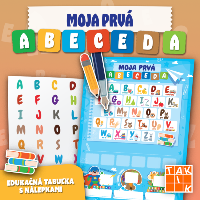 - 1× tabuľku „Moja prvá abeceda“ – písmenková predloha s obrázkami, priestorom na nalepovanie písmen a tvorbu slov.