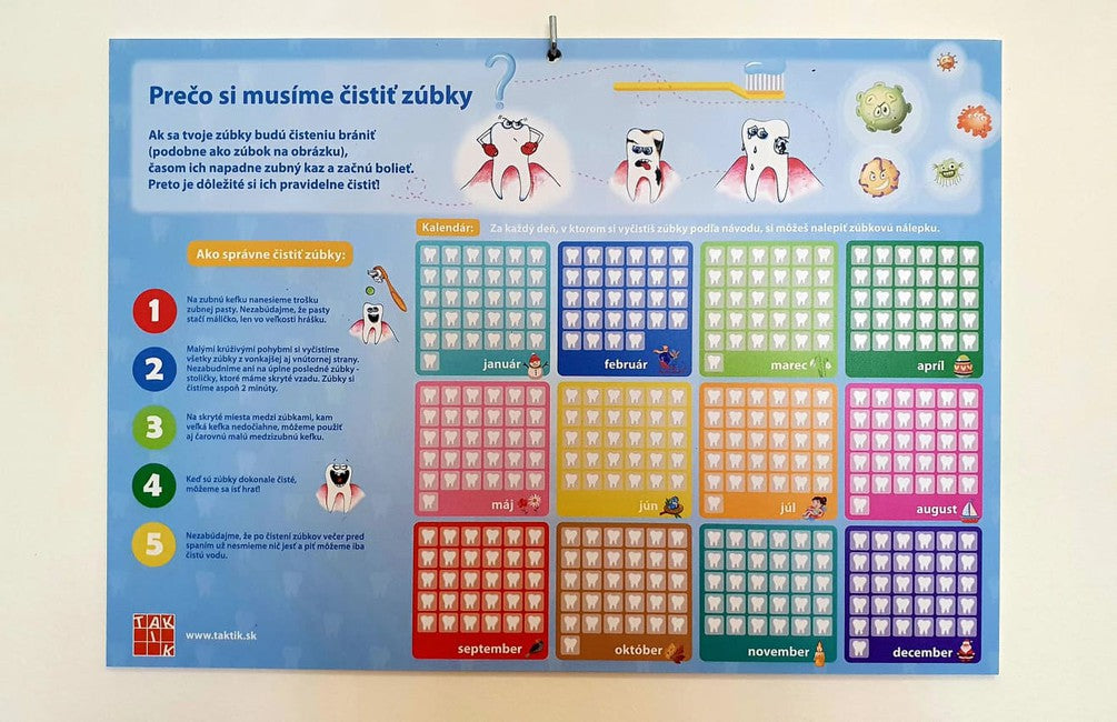 - 1× tabuľku „Prečo si čistíme zúbky?“ – návod na správne čistenie zubov a celoročný kalendár na nalepovanie zúbkových samolepiek.