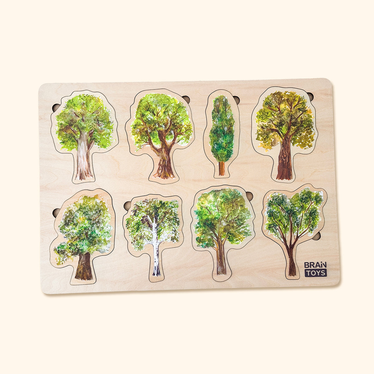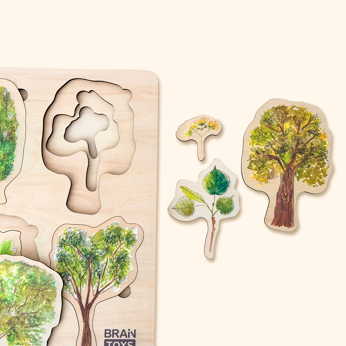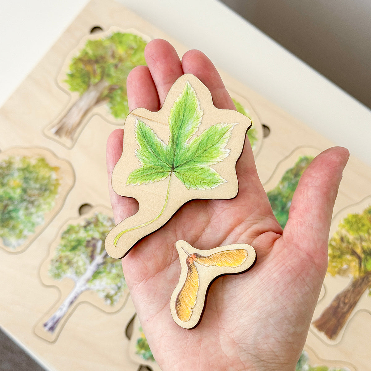 - drevené puzzle s tromi vrstvami 8 druhov stromov