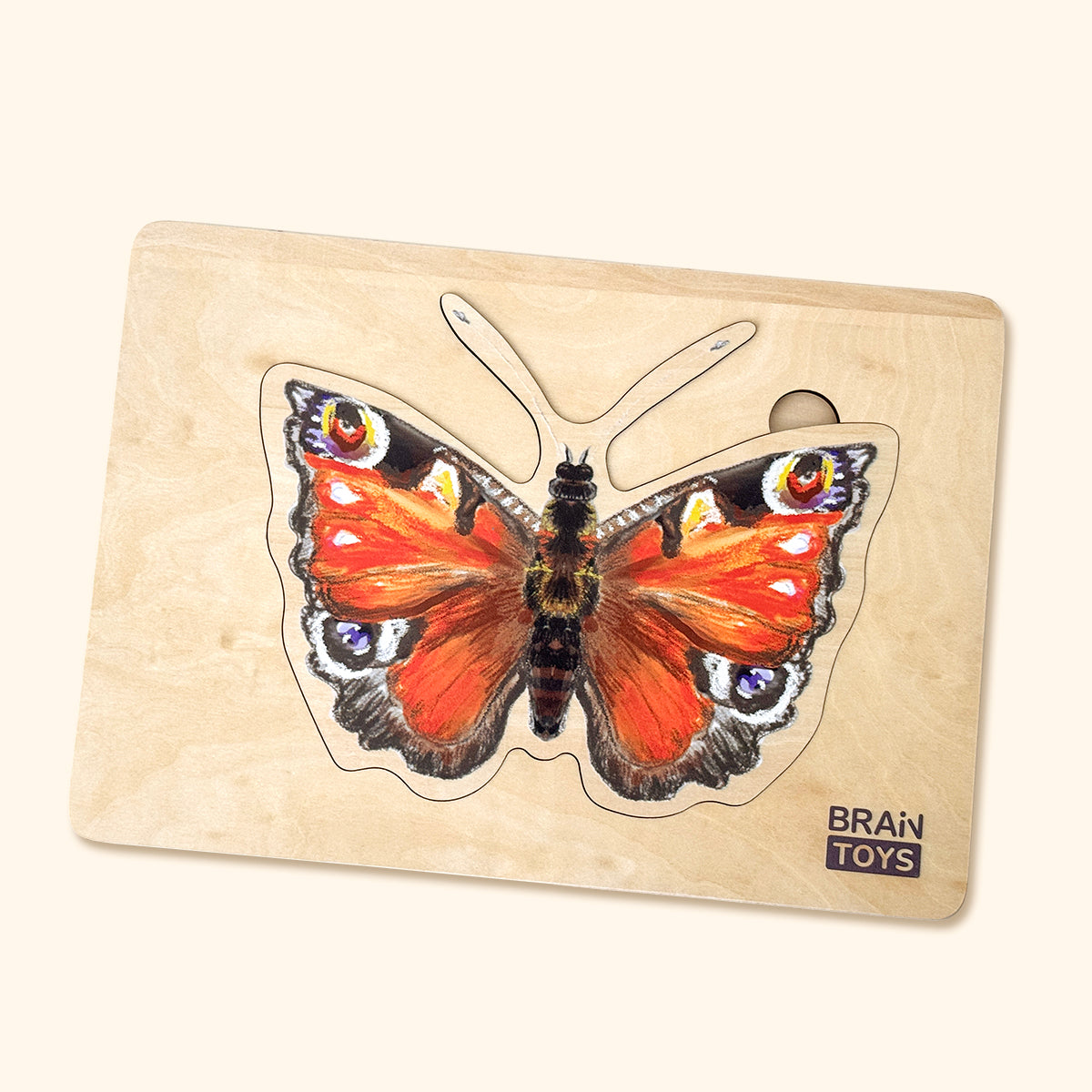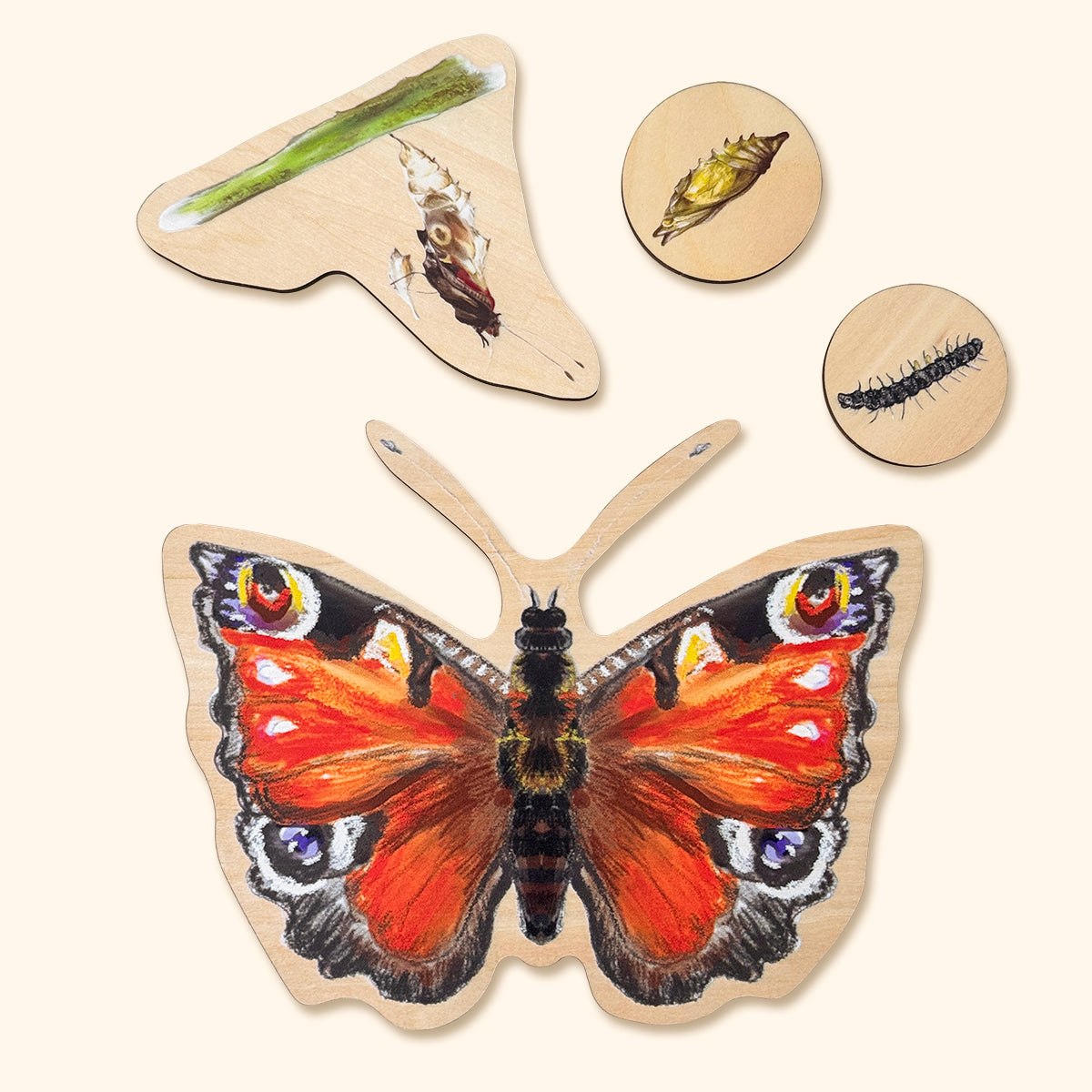 - drevené puzzle znázorňujúce jednotlivé štádiá vývoja motýľa.