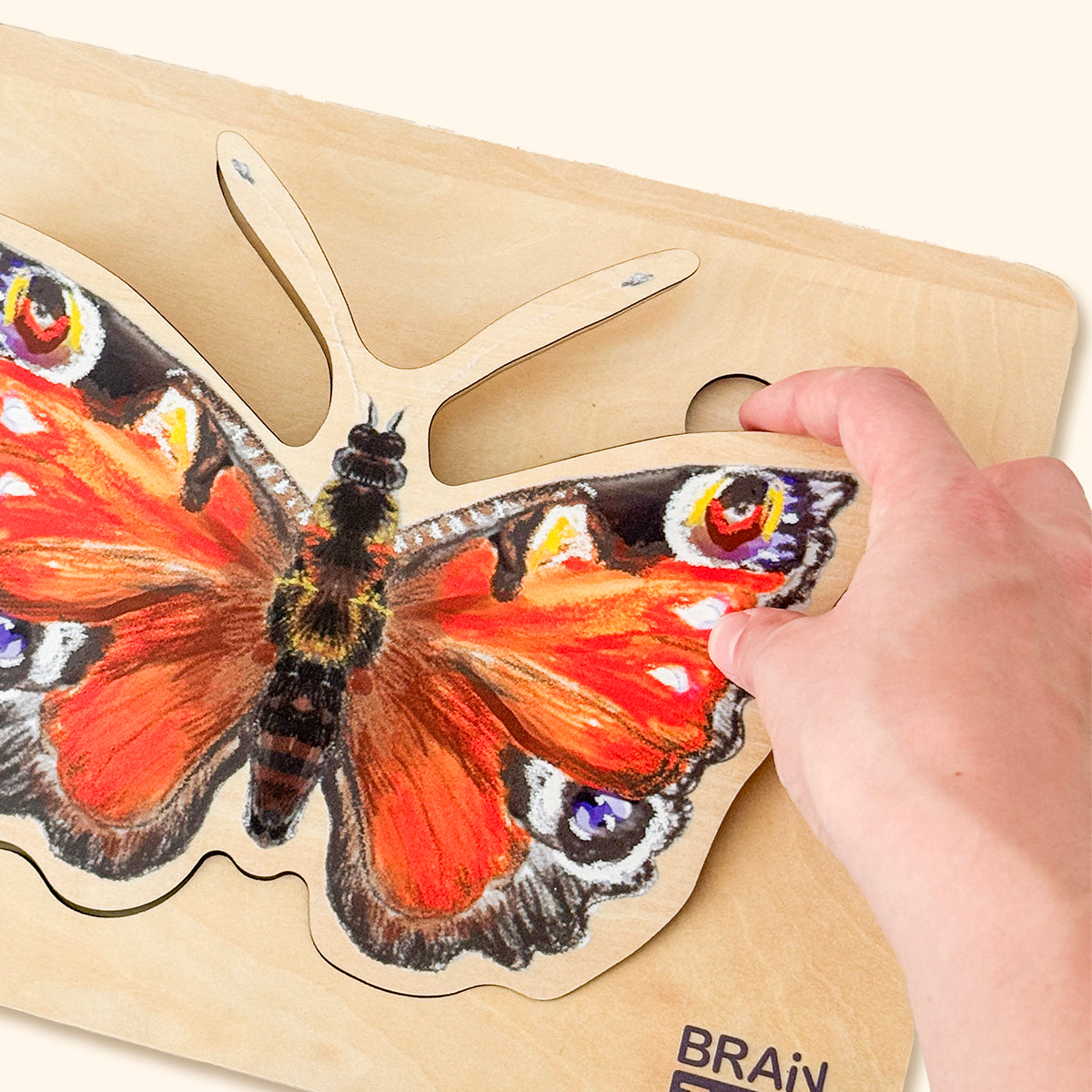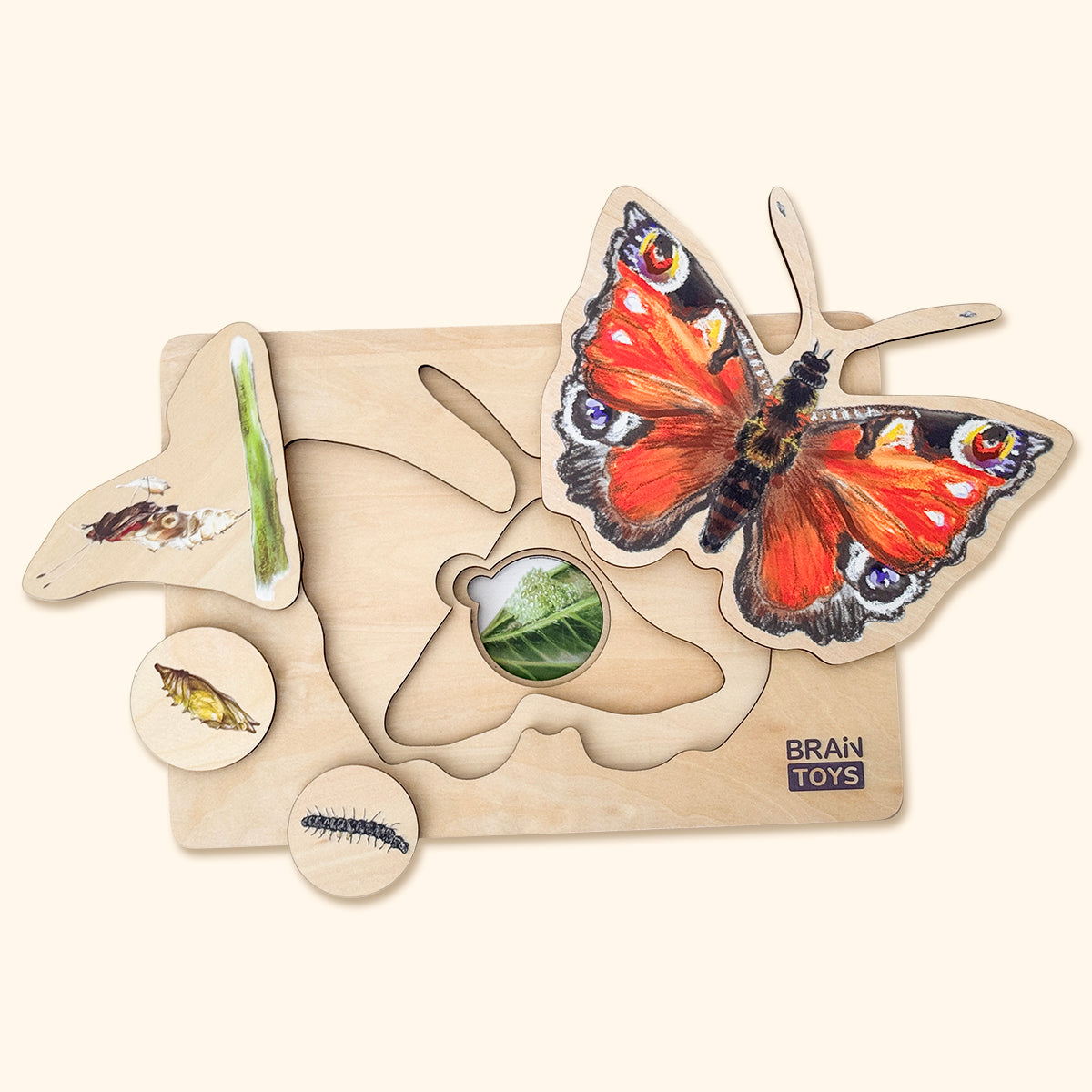 Ukážte deťom zázračný proces premeny húsenice na motýľa! Toto drevené puzzle v piatich vrstvách im umožní spoznať celý vývojový cyklus hmyzu hravou formou.