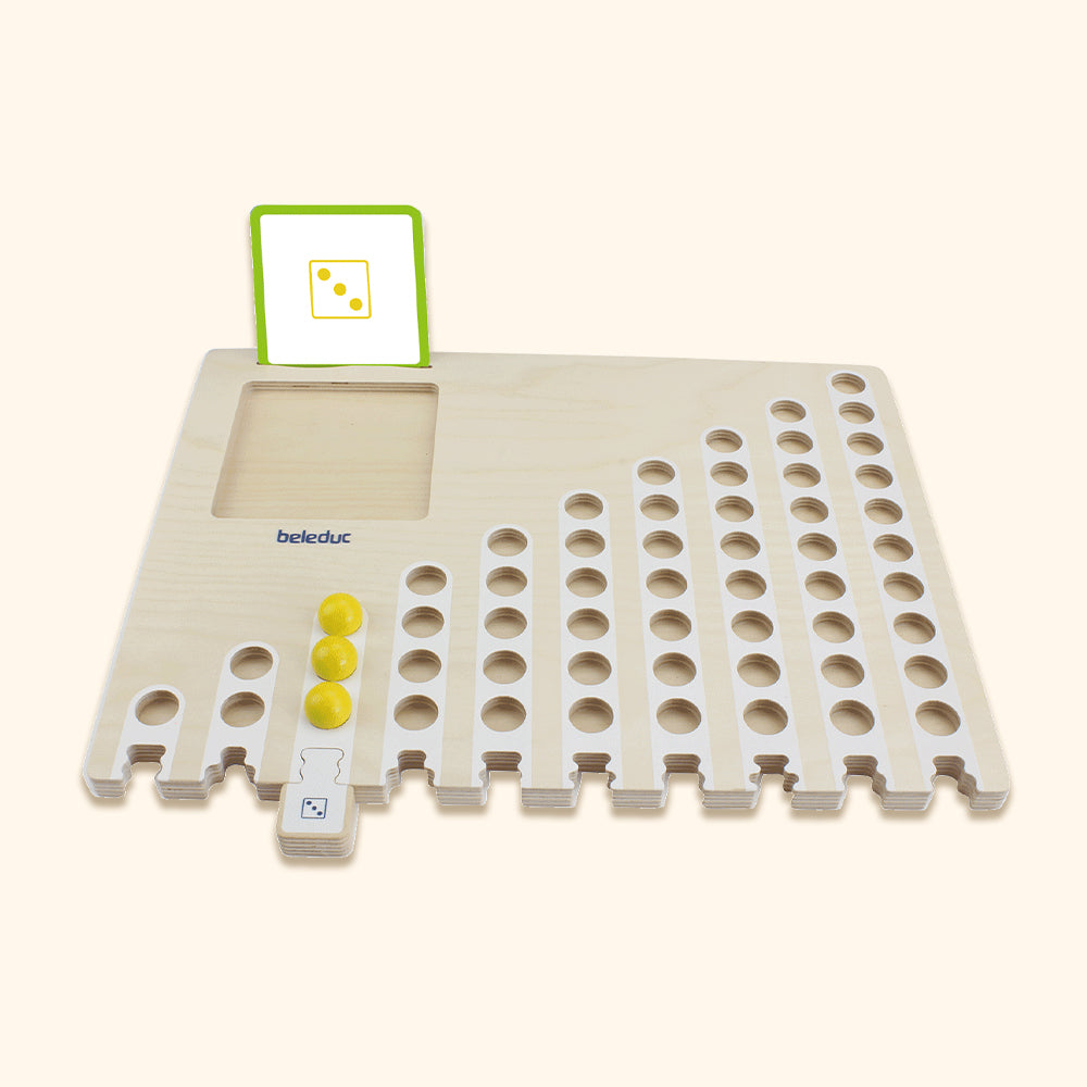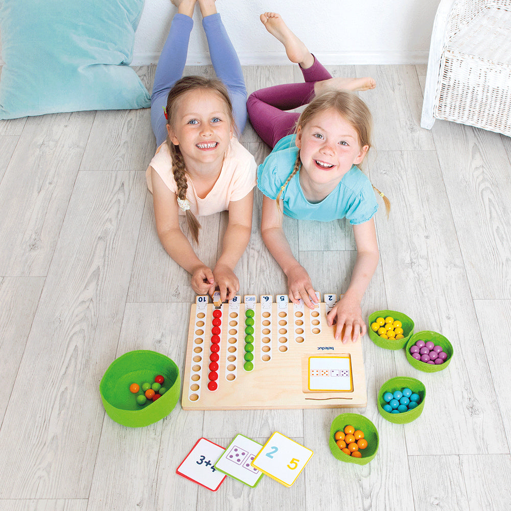 Obzvlášť s týmito farebnými drevenými guličkami, ktoré deti umiestňujú na triediacu dosku. Kartičky s úlohami sú k dispozícii v rôznych stupňoch obtiažnosti, čím sa dajú prispôsobiť úrovni vedomostí detí. Či už samostatne, alebo v skupine – deti takto objavujú číselný rozsah od 1 do 10 hravou formou.