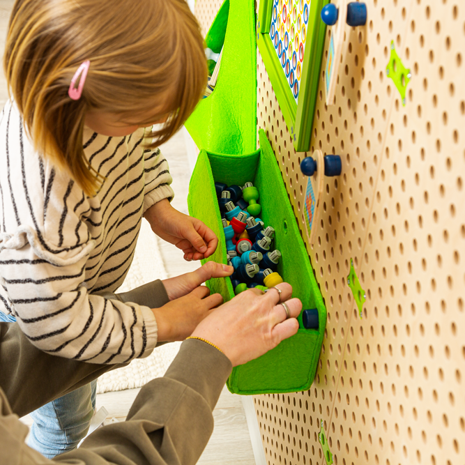 Pripojte vrecká na dosku modulárneho systému pomocou plugov. Do vreciek vkladajte dieliky, hračky alebo pomôcky – možno ich využiť pri hre ako úložné „stanice“, zásobníky alebo dokonca ako súčasť hry (napr. obchodík, triedenie, výber pomôcok). Vrecká možno ľahko premiestniť alebo odstrániť podľa potreby.