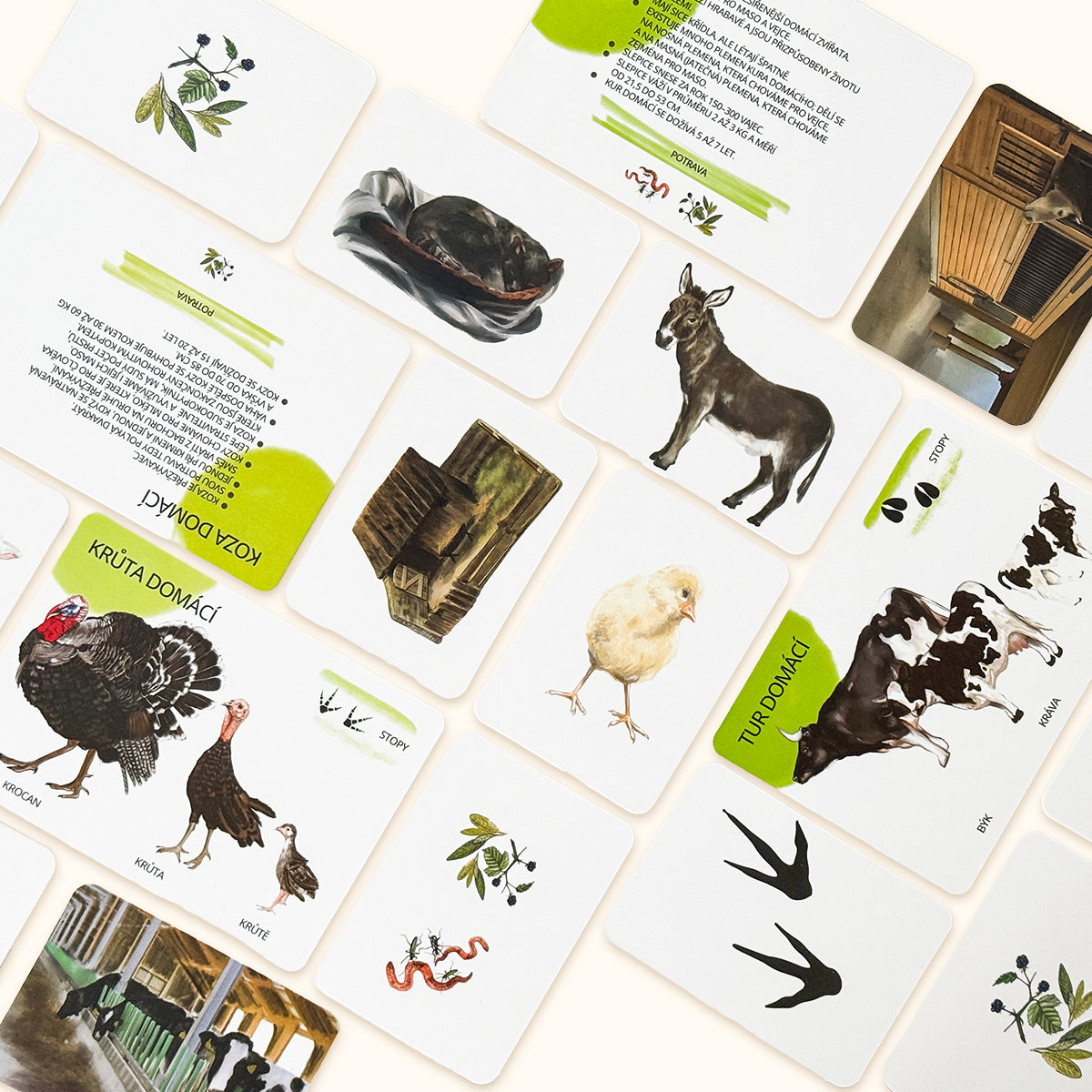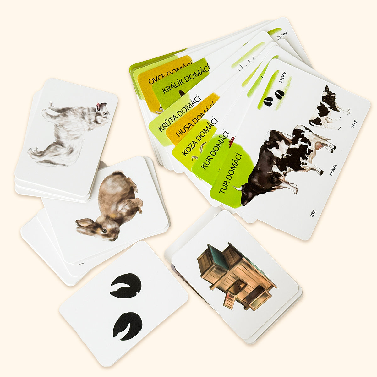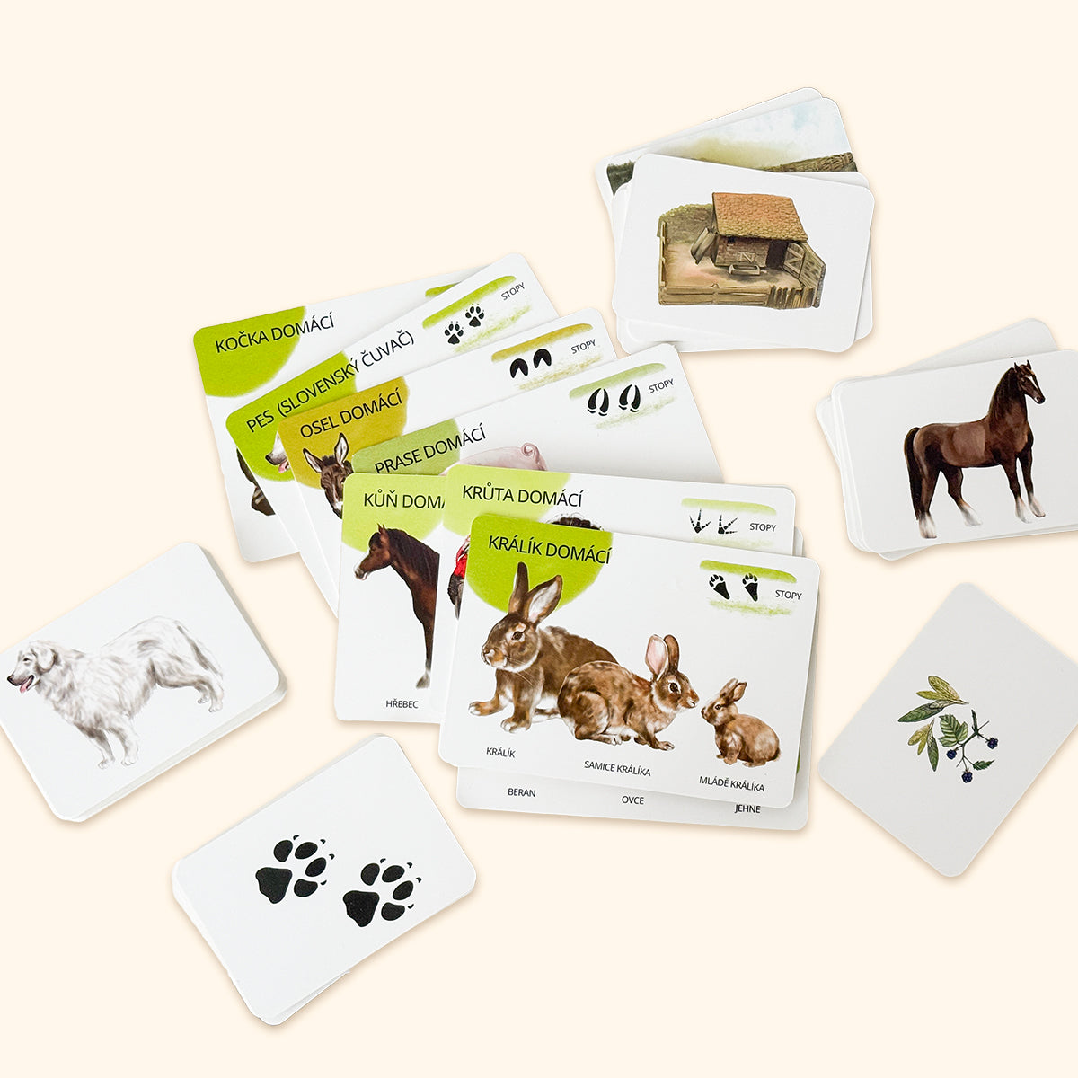 - 12 kariet v češtine vo formáte A6 (na prednej strane sa nachádza názov zvieraťa, vyobrazenie samca, samice, mláďaťa a stopa, ktorú zanecháva; na zadnej strane je stručný text a vyobrazenie prirodzenej potravy, ktorou sa zvieratko živí)