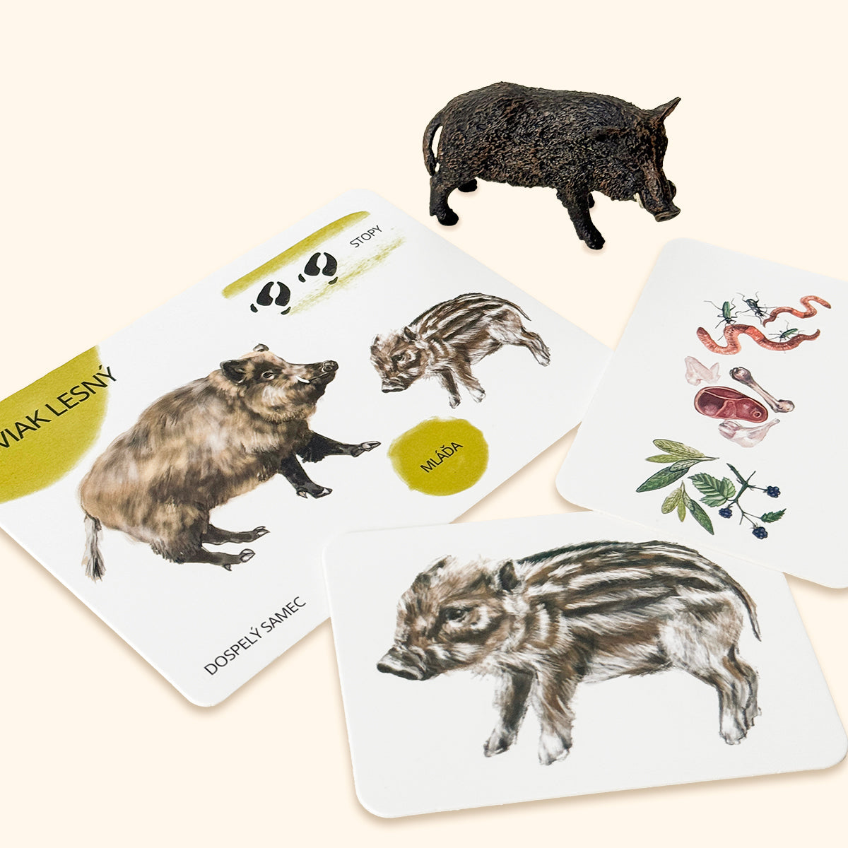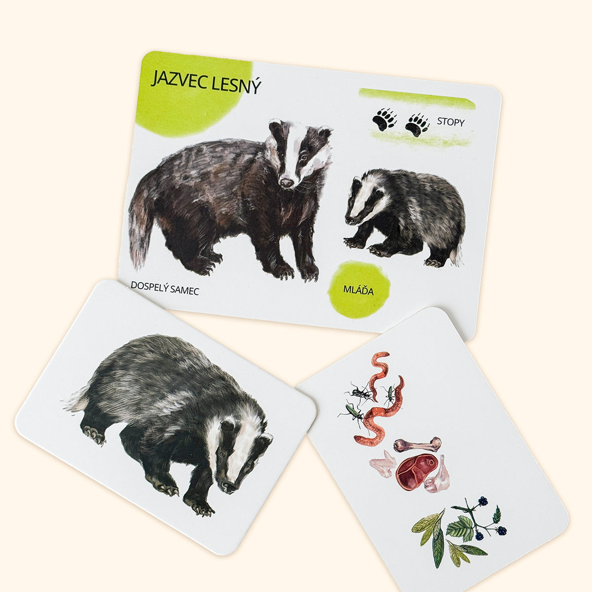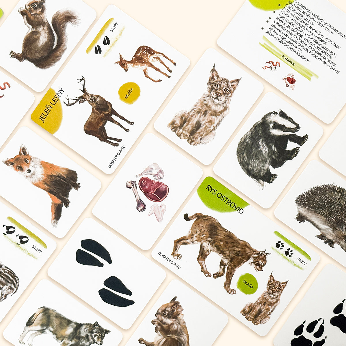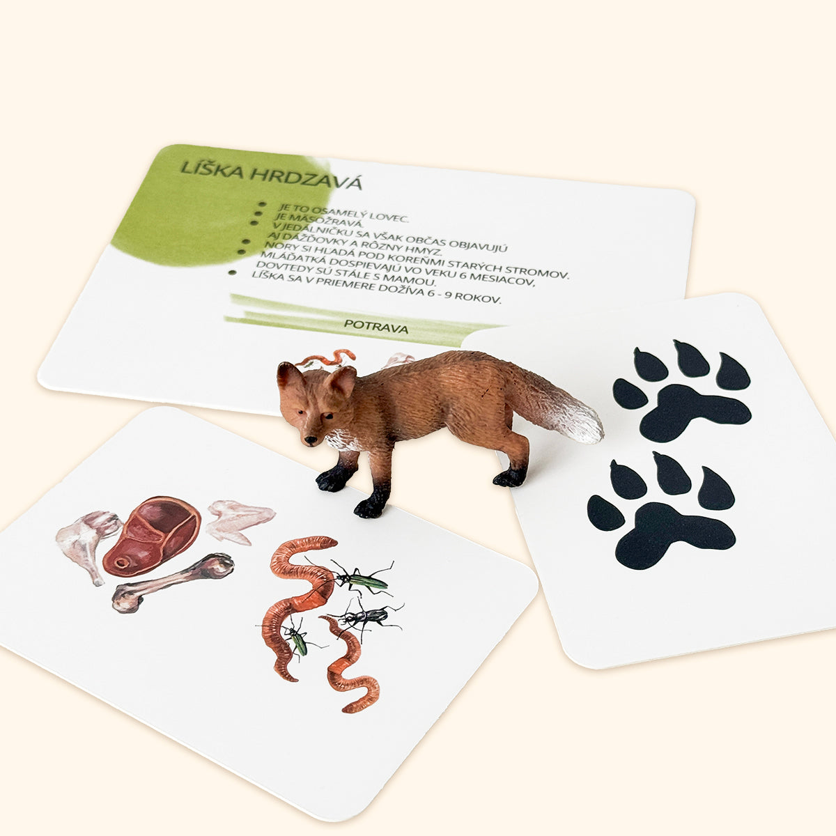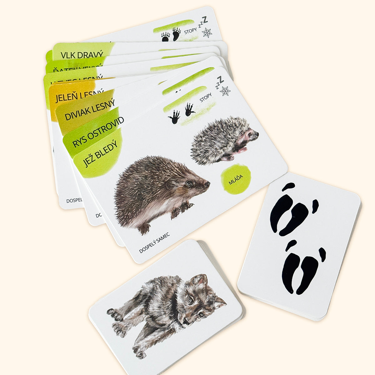 - 10 obojstranných kariet vo formáte A6 (na prednej strane je názov zvieraťa, mláďa a stopa, ktorú zanecháva, na zadnej strane je stručný text a vyobrazenie prirodzenej potravy, ktorou sa zvieratko živí)