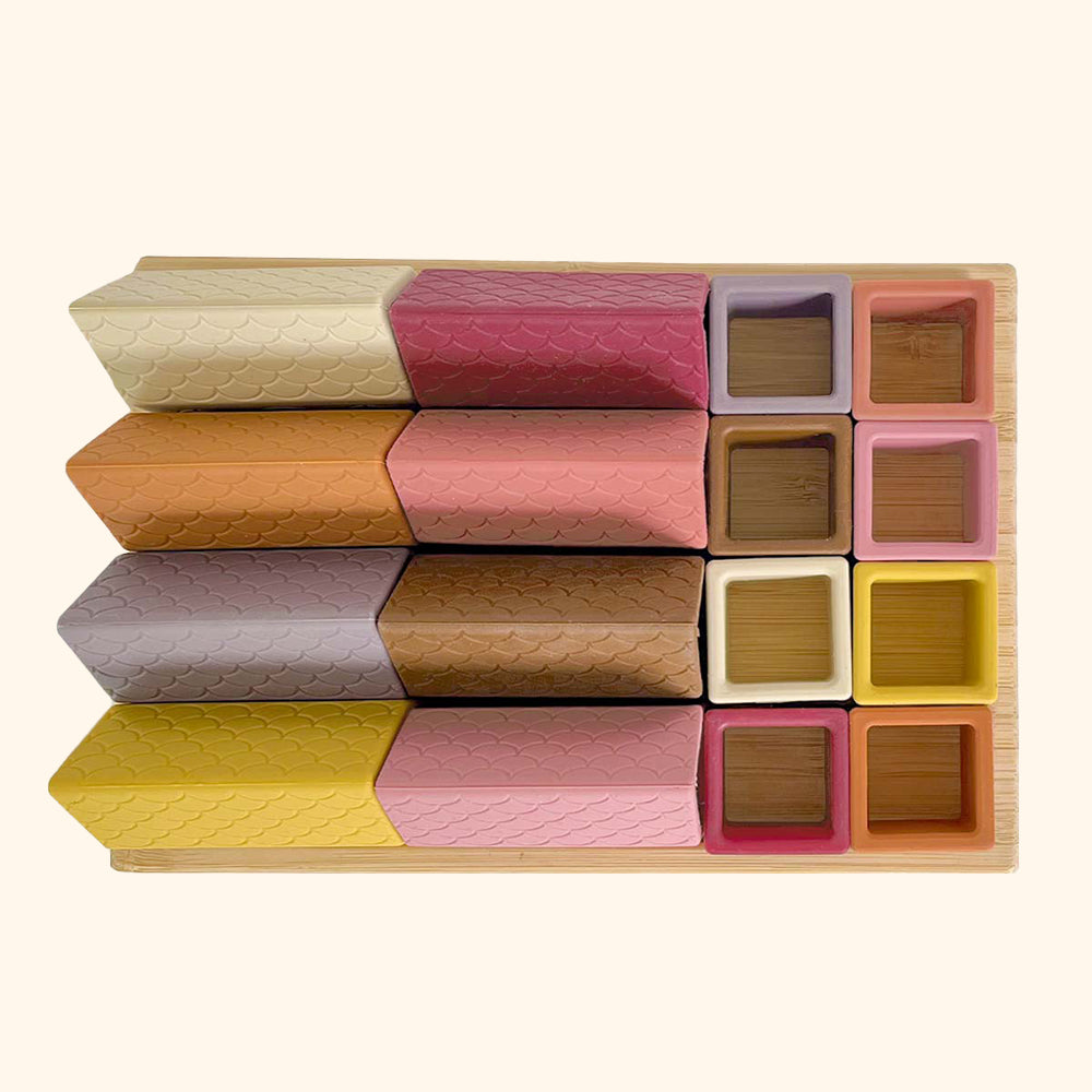 Silikónove hračky sú vďaka svojej bezpečnosti a odolnosti veľmi obľúbené. Silikón je pružný, bezpečný a netoxický materiál. Táto všestranná vzdelávacia hračka podporuje koordináciu ruka-oko, kreatívne myslenie a zručnosti pri riešení problémov.