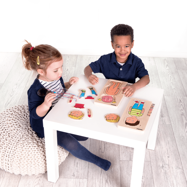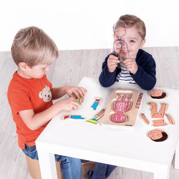 Deti postupne skladajú vrstvy puzzle — najprv oblečené telo, potom svaly, orgány, kostru — a pritom môžu diskutovať o tom, čo jednotlivé časti robia. Hra podporuje samostatné objavovanie aj spoločnú aktivitu.