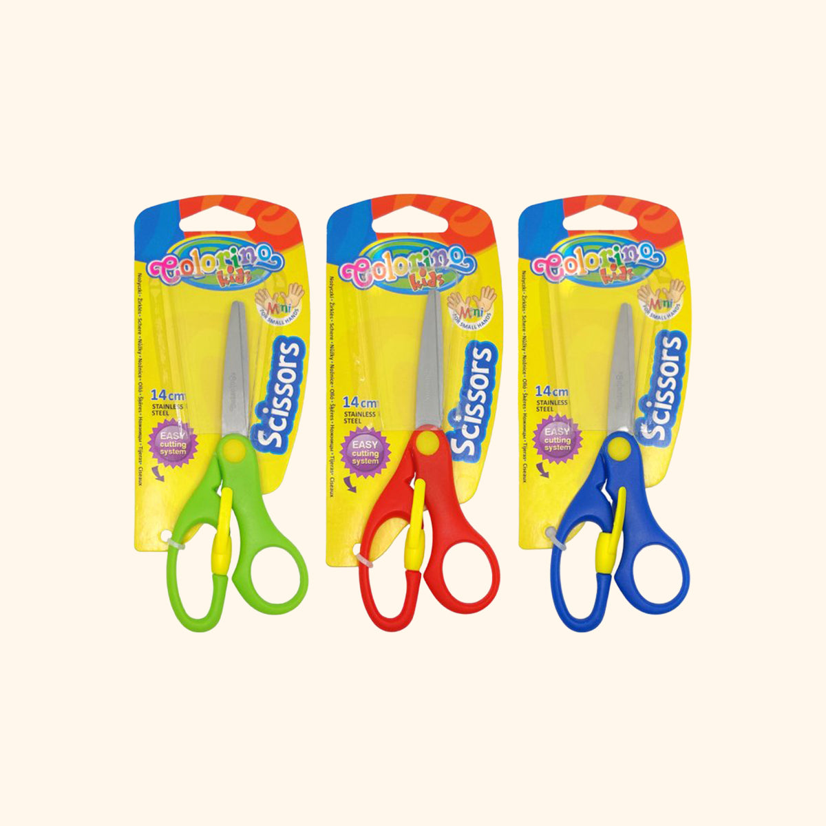 Nožnice detské, 14 cm, bezp. poistka, asymetrické, mix farieb