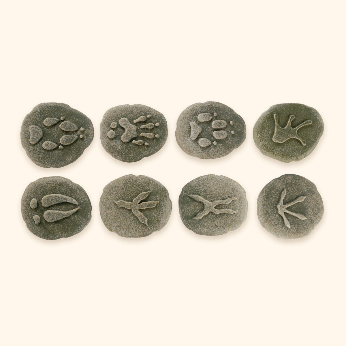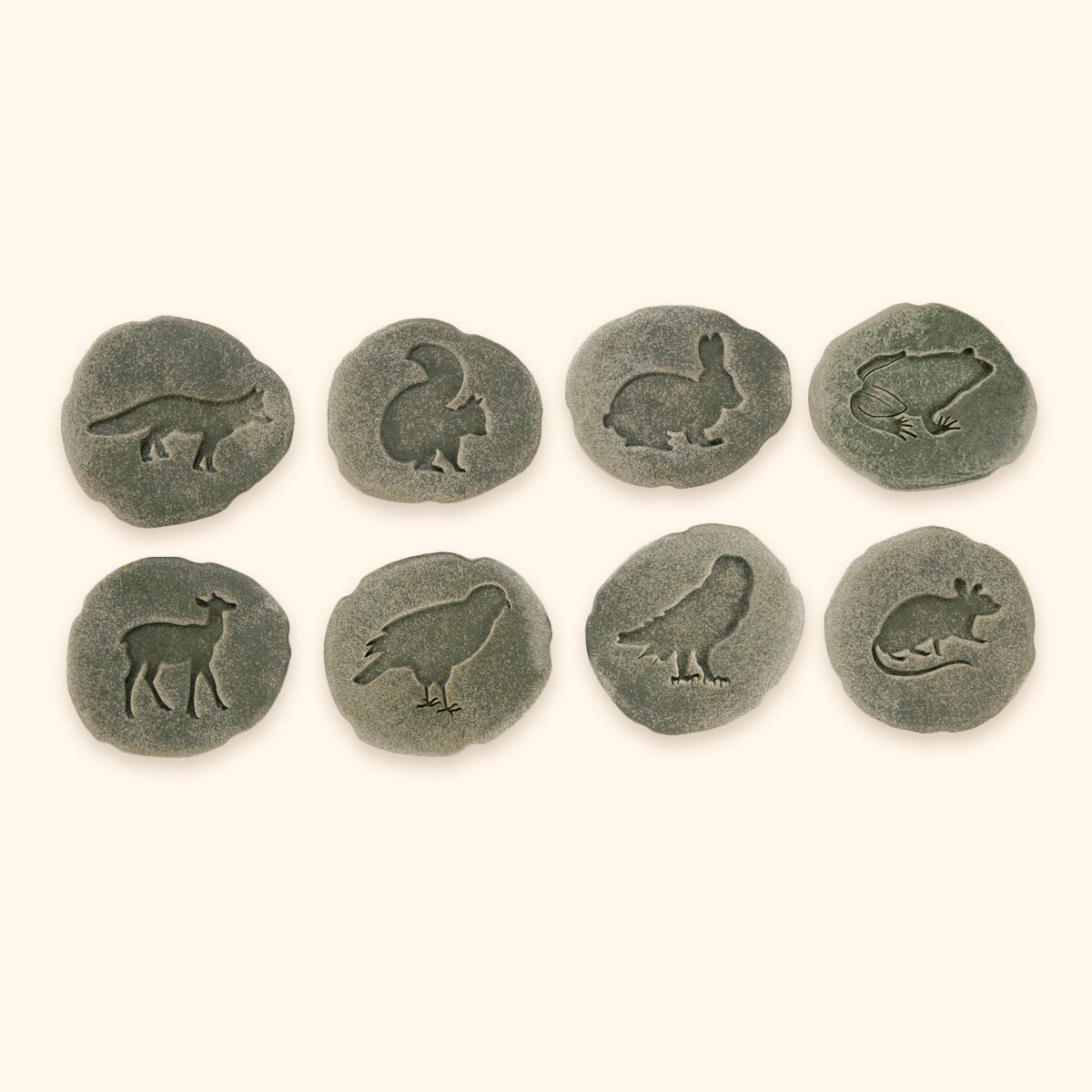 • jednotlivé kamene obsahujú na prednej strane odtlačok lesného zvieraťa a na zadnej jeho stopu (líška, veverička, králik, žaba, jeleň, syseľ, sova, myš).